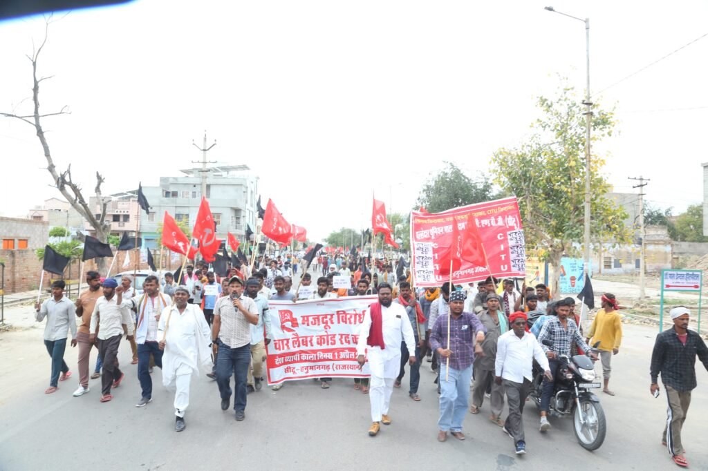 हनुमानगढ़। केंद्र सरकार द्वारा चार श्रम संहिताओं को लागू किए जाने के विरोध में मंगलवार को जिले में श्रमिक संगठनों ने ‘राष्ट्रव्यापी काला दिवस’ मनाया। इस दौरान सीटू सहित विभिन्न ट्रेड यूनियनों के बैनर तले श्रमिकों ने काले बैज लगाकर विरोध प्रदर्शन किया और जंक्शन धानमंडी से जिला कलेक्ट्रेट तक रोष मार्च निकाला।