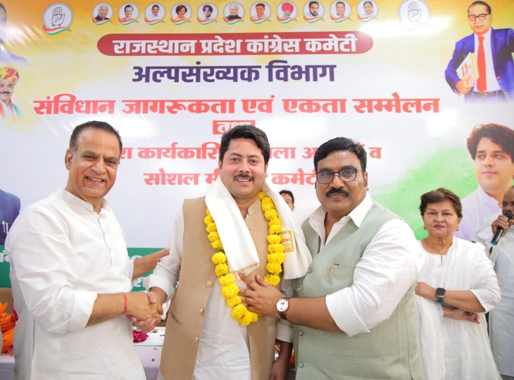 हनुमानगढ़। हनुमानगढ़ के जावेद अली टाक का प्रदेश कांग्रेस मुख्यालय जयपुर में आयोजित कार्यक्रम के दौरान सम्मान किया गया। राजस्थान प्रदेश कांग्रेस कमेटी (अल्पसंख्यक विभाग) द्वारा पीसीसी कार्यालय में प्रथम कार्यकारिणी बैठक के साथ “संविधान जागरूकता एवं एकता सम्मेलन” का भव्य आयोजन किया गया, जिसमें प्रदेशभर से पदाधिकारी शामिल हुए।