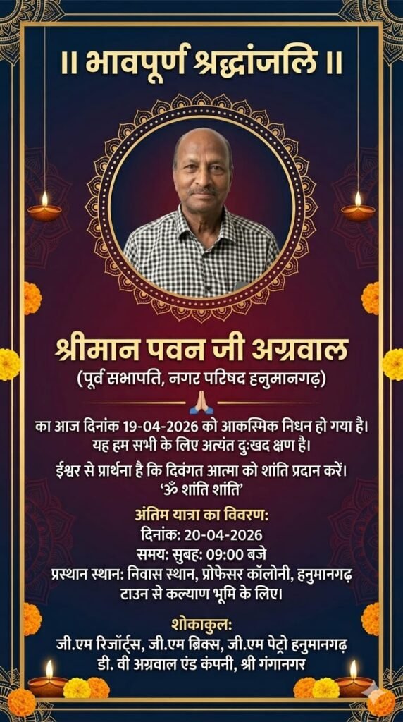 हनुमानगढ़। शहर के लिए एक दुखद खबर सामने आई है। नगरपरिषद के पूर्व सभापति रहे पवन अग्रवाल का निधन हो गया है। वे पिछले कुछ समय से अस्वस्थ चल रहे थे और उपचार के दौरान उन्होंने अंतिम सांस ली।